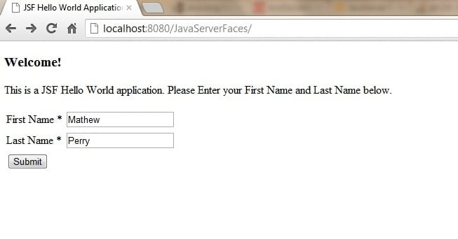</html>The #{ } indicate as a JSF expression language, in this case, #{helloWorldBean.firstName} and #{helloWorldBean.lastName}, when the page is submitted, JSF will find the “helloWorldBean” and set the submitted textbox value via the setFirstName() method. When hello.xhtml page is displayed, JSF will find the “helloWorldBean” and displays the firstName and lastName property value via the getFirstName() and getLastName() methods respectively.